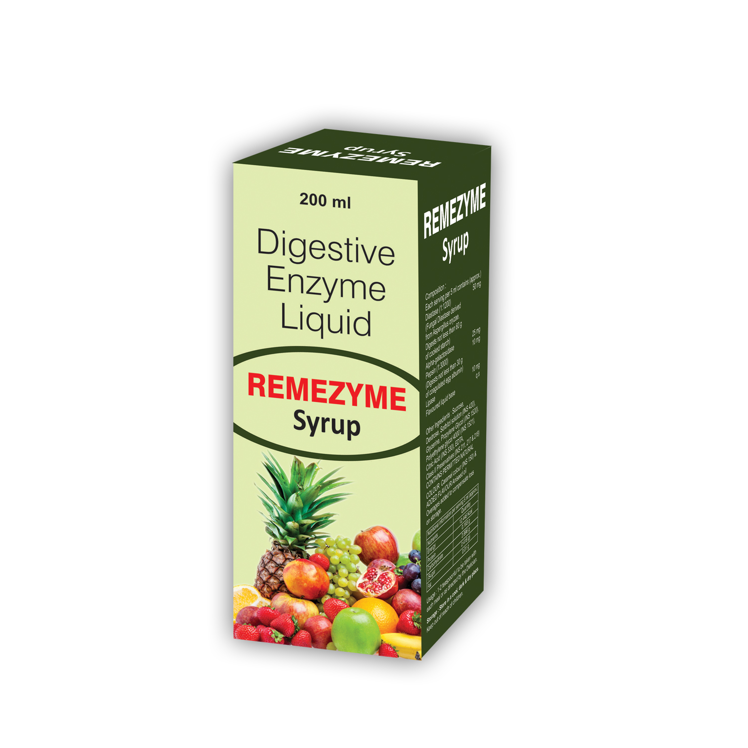 Alpha Galactosidase 25mg, Lipase 10mg, Diastase (1:1200) 50mg, Pepsin (1:3000) 10mg Syrup