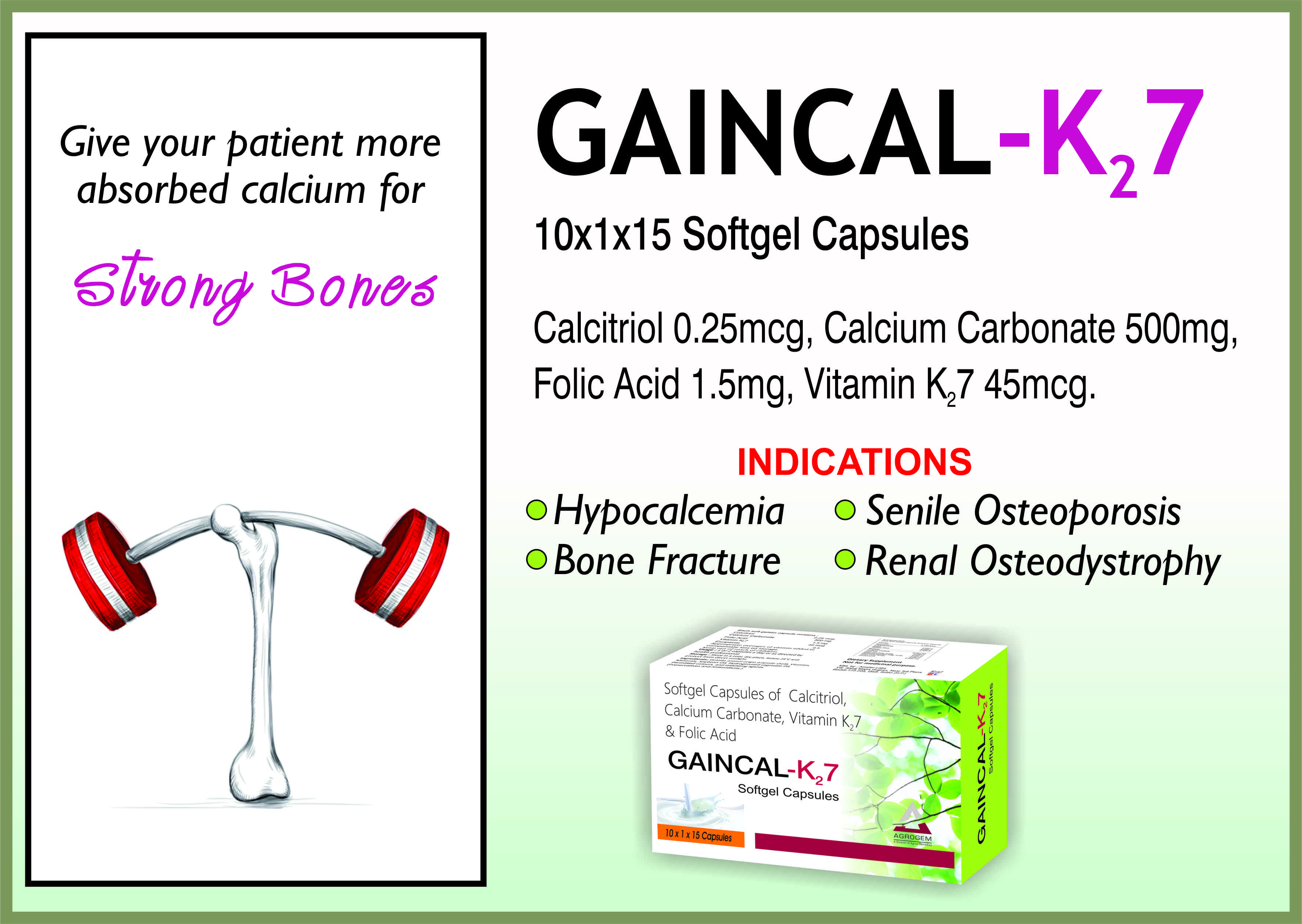 GAINCAL-K2 7 SOFTGEL CAPSULE Product Name : GAINCAL-K2 7 SOFTGEL CAPSULE Composition : Calcitriol 0.25mcg, Calcium Carbonate 625mg, Vit. " Colour : N/A DOSAGE : As Directed by the Physician. STORAGE : Store in a cool, dark & dry place. Manufactured By : AGRON REMEDIES PVT. LTD. Certified Plant : WHO-GMP, ISO 9001-2015, TCL & JAS-ANZ Certified Company since 1986. Marketed By : AGRON REMEDIES PVT. LTD. Contact Number : +91 8859000627 Email Address : remedies.agron@gmail.com Official Websites : www.agronremedies.com www.agrogem.net Our Service : PCD Pharma Franchise, Third Party Manufacturing, Export & Govt. Tender Supply. "