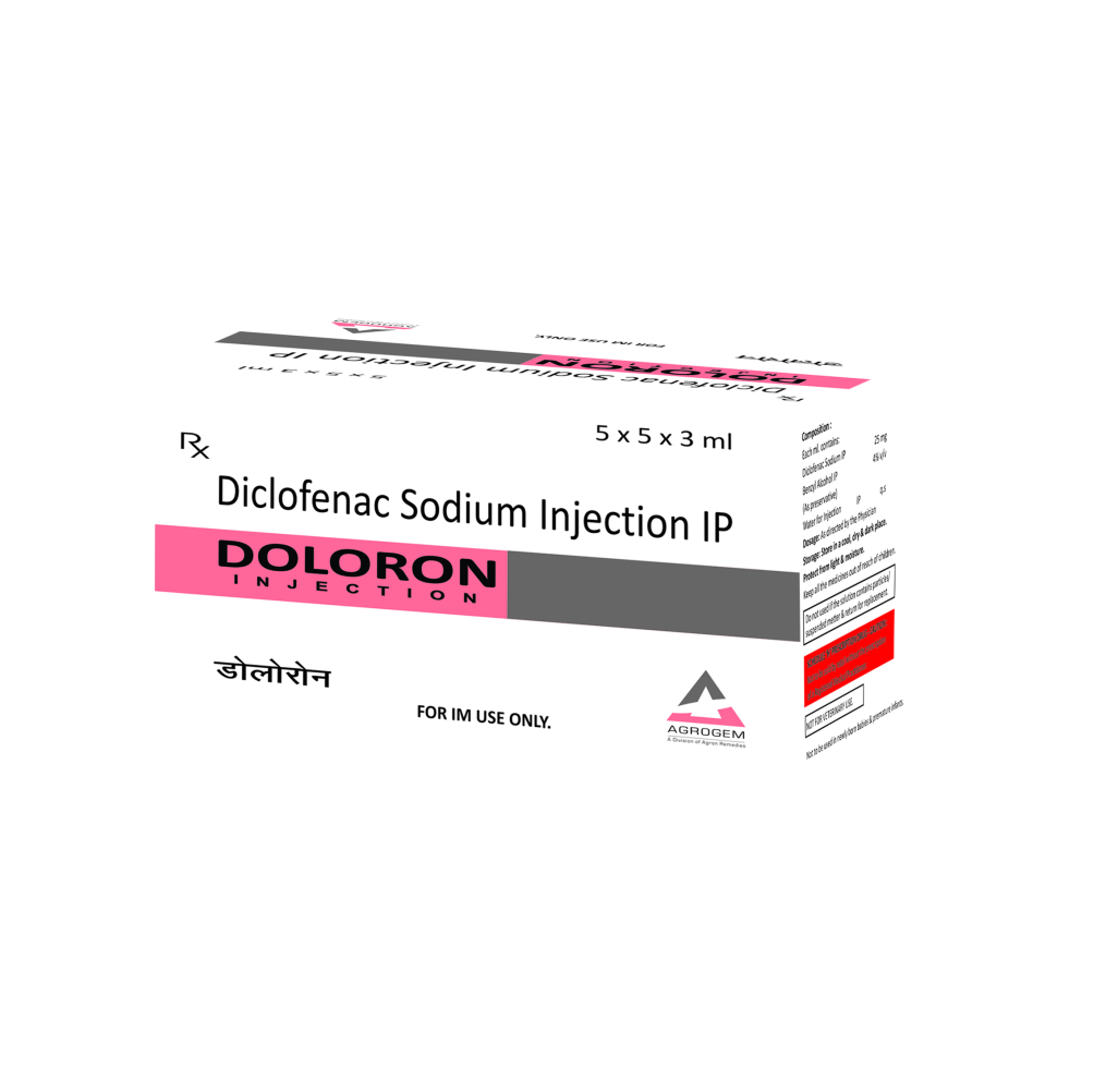 DOLORON INJECTION Product Name : DOLORON INJECTION Composition : Diclofenac Sod. 25mg/ml INJECTION Packing : 5X5X3ML INJECTION Packing Type : w/cart. Colour : N/A DOSAGE : As Directed by the Physician. STORAGE : Store in a cool, dark & dry place. Manufactured By : AGRON REMEDIES PVT. LTD. Certified Plant : WHO-GMP, ISO 9001-2015, TCL & JAS-ANZ Certified Company since 1986. Marketed By : AGRON REMEDIES PVT. LTD. Contact Number : +91 8859000627 Email Address : remedies.agron@gmail.com Official Websites : www.agronremedies.com www.agrogem.net Our Service : PCD Pharma Franchise, Third Party Manufacturing, Export & Govt. Tender Supply.
