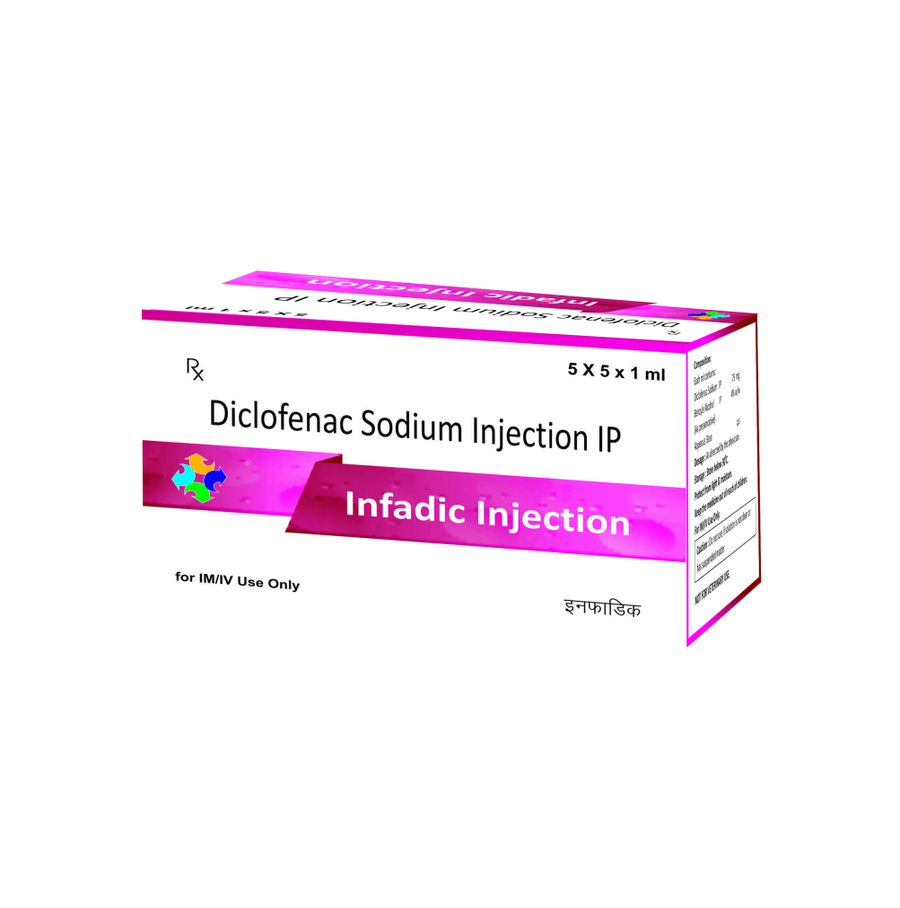 INFADIC INJECTION Product Name : INFADIC INJECTION Composition : Diclofenac Sod. 75mg/ml INJECTION Packing : 5x5x1ml INJECTION Packing Type : w/cart. Colour : N/A DOSAGE : As Directed by the Physician. STORAGE : Store in a cool, dark & dry place. Manufactured By : AGRON REMEDIES PVT. LTD. Certified Plant : WHO-GMP, ISO 9001-2015, TCL & JAS-ANZ Certified Company since 1986. Marketed By : AGRON REMEDIES PVT. LTD. Contact Number : +91 8859000627 Email Address : remedies.agron@gmail.com Official Websites : www.agronremedies.com www.agrogem.net Our Service : PCD Pharma Franchise, Third Party Manufacturing, Export & Govt. Tender Supply.