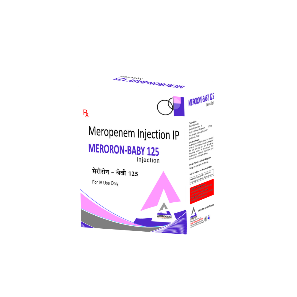 MERORON BABY 125 INJECTION Product Name : MERORON BABY 125 INJECTION Composition : Meropenem eq. Colour : N/A DOSAGE : As Directed by the Physician. STORAGE : Store in a cool, dark & dry place. Manufactured By : AGRON REMEDIES PVT. LTD. Certified Plant : WHO-GMP, ISO 9001-2015, TCL & JAS-ANZ Certified Company since 1986. Marketed By : AGRON REMEDIES PVT. LTD. Contact Number : +91 8859000627 Email Address : remedies.agron@gmail.com Official Websites : www.agronremedies.com www.agrogem.net Our Service : PCD Pharma Franchise, Third Party Manufacturing, Export & Govt. Tender Supply.
