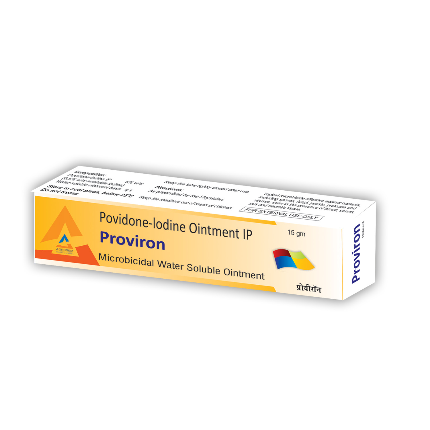 PROVIRON Cream - Derma Product Name : PROVIRON OINT. Composition : Povidone Iodine 5% w/w Packing : 15 gm Packing Type : w/cart. Colour : N/A DOSAGE : As Directed by the Physician. STORAGE : Store in a cool, dark & dry place. Manufactured By : AGRON REMEDIES PVT. LTD. Certified Plant : WHO-GMP, ISO 9001-2015, TCL & JAS-ANZ Certified Company since 1986. Marketed By : AGRON REMEDIES PVT. LTD. Contact Number : +91 8859000627 Email Address : remedies.agron@gmail.com Official Websites : www.agronremedies.com www.agrogem.net Our Service : PCD Pharma Franchise, Third Party Manufacturing, Export & Govt. Tender Supply.