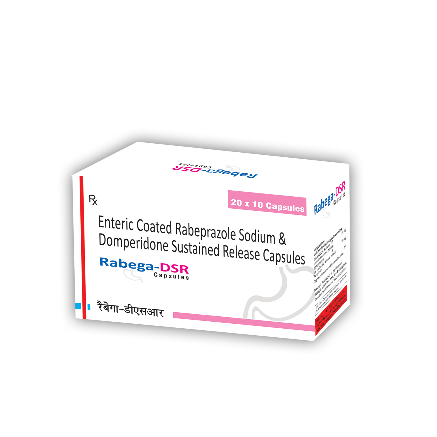 RABEGA DSR Capsules combine Rabeprazole 20 mg and Domperidone 30 mg (SR) for effective relief from acid reflux, GERD, heartburn, and gastric discomfort. Packaged in 20?10 ALU-ALU strips. MRP ?2600. Trusted gastrointestinal health support.