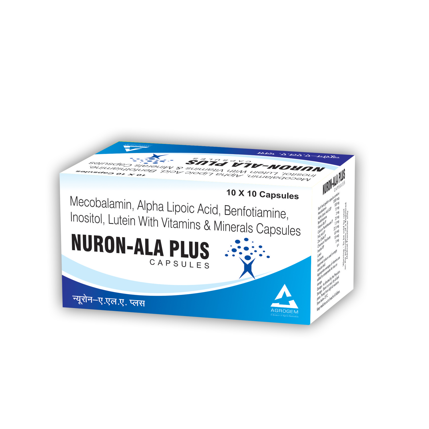 Composition: Methylcobalamin 1500mcg, ALA 100mg, Benfotiamine 15mg, Vita. B6 3mg, Calcium pantothenate 25mg, Folic acid 1.5mg, Inositol 10mcg, Lutein 5mg Capsules | Packing: 10x10 ALU-ALU Capsules | Dosage: As Directed by the Physician.