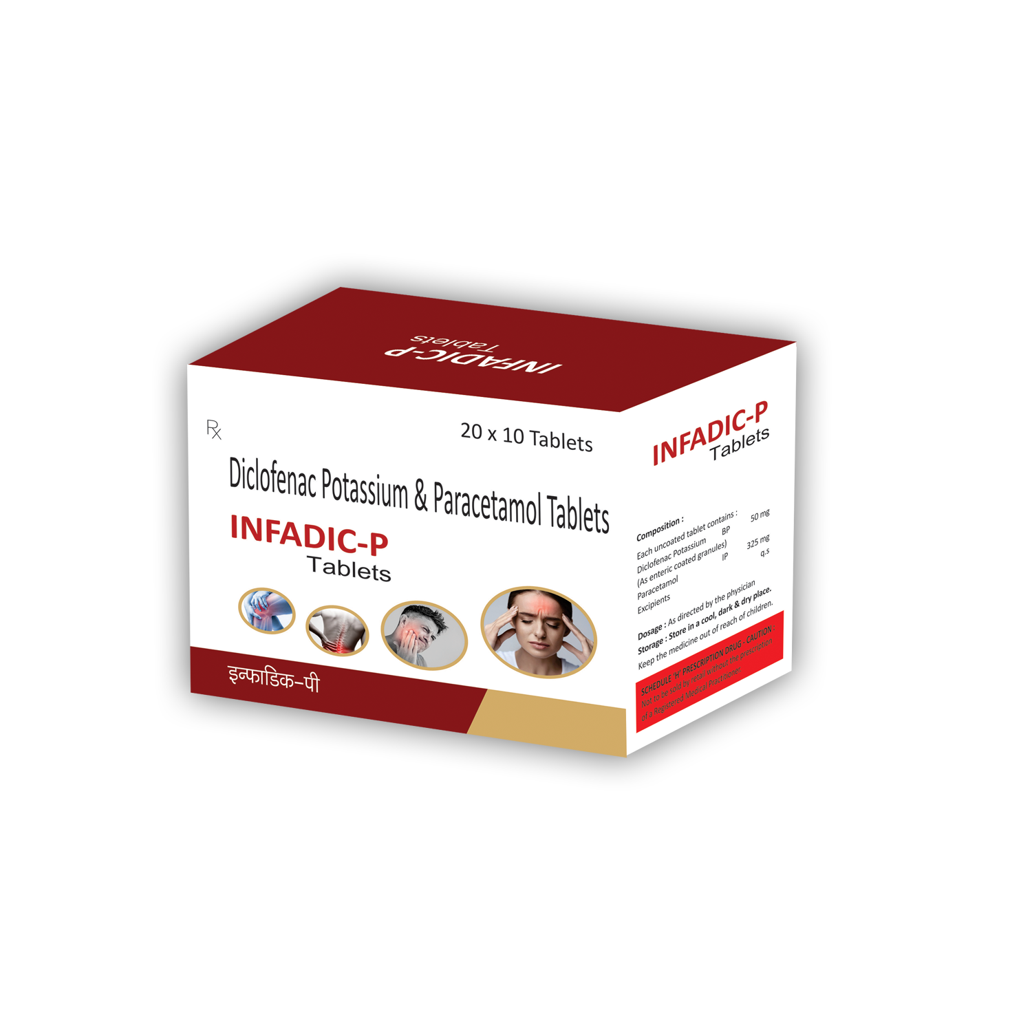 Composition: Diclofenac Potassium 50mg Paracetamol 325mg | Packing: 20*10 ALU-ALU Tablets | Dosage: As Directed by the Physician.