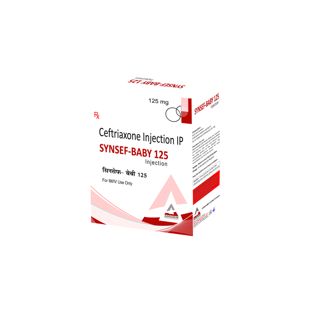 SYNSEF-BABY-125 INJECTION Product Name : SYNSEF-BABY- 125 INJECTION Composition : Ceftriaxone 125mg INJECTION Packing : 1 vial INJECTION Packing Type : with WFI INJECTION MRP : 25 Per Box. Colour : N/A DOSAGE : As Directed by the Physician. STORAGE : Store in a cool, dark & dry place. Manufactured By : AGRON REMEDIES PVT. LTD. Certified Plant : WHO-GMP, ISO 9001-2015, TCL & JAS-ANZ Certified Company since 1986. Marketed By : AGRON REMEDIES PVT. LTD. Contact Number : +91 8859000627 Email Address : remedies.agron@gmail.com Official Websites : www.agronremedies.com www.agrogem.net Our Service : PCD Pharma Franchise, Third Party Manufacturing, Export & Govt. Tender Supply.