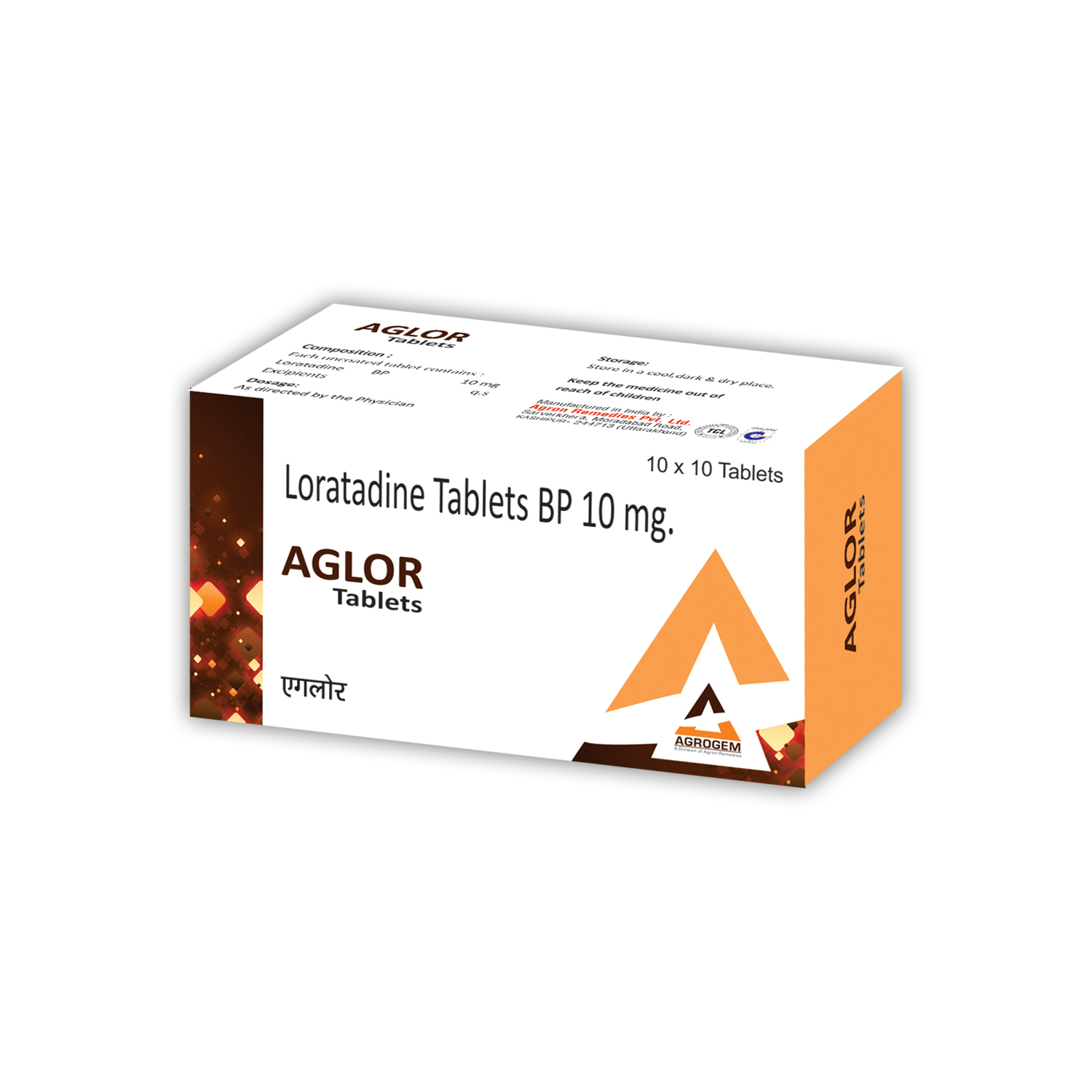 AGLOR Tablets Product Name : AGLOR Tablets Tablets Composition : Loratidine 10mg Tablets Packing : 10x10 Tablets Packing Type : BL Tablets MRP : 660 Per Box. Colour : N/A DOSAGE : As Directed by the Physician. STORAGE : Store in a cool, dark & dry place. Manufactured By : AGRON REMEDIES PVT. LTD. Certified Plant : WHO-GMP, ISO 9001-2015, TCL & JAS-ANZ Certified Company since 1986. Marketed By : AGRON REMEDIES PVT. LTD. Contact Number : +91 8859000627 Email Address : remedies.agron@gmail.com Official Websites : www.agronremedies.com www.agrogem.net Our Service : PCD Pharma Franchise, Third Party Manufacturing, Export & Govt. Tender Supply.