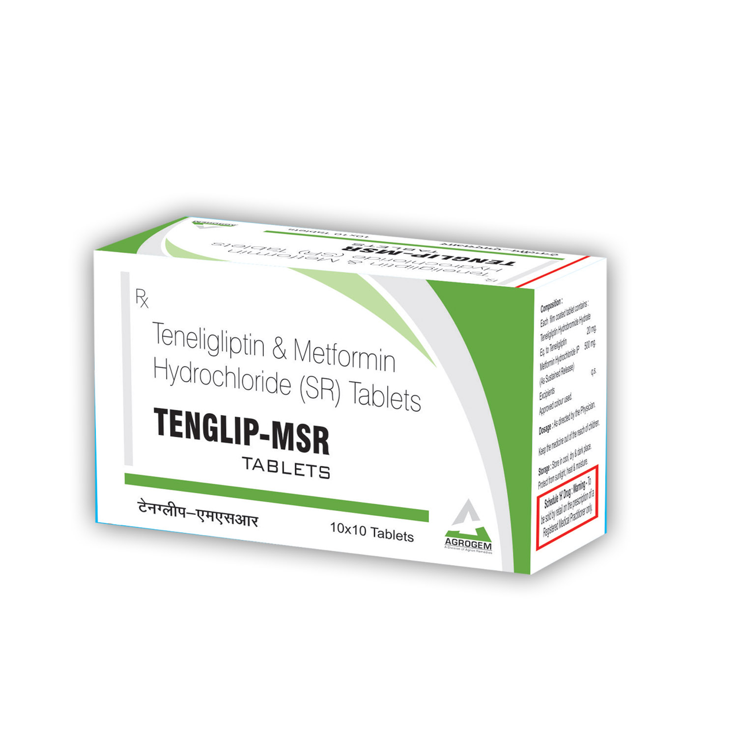 TENGLIP -MSR Tablets Product Name : TENGLIP -MSR Tablets Tablets Composition : Teneligliptin 20mg,Metformin 500 mg Tablets Packing : 10*10 Tablets Packing Type : ALU-ALU Tablets MRP : 1240 Per Box. Colour : N/A DOSAGE : As Directed by the Physician. STORAGE : Store in a cool, dark & dry place. Manufactured By : AGRON REMEDIES PVT. LTD. Certified Plant : WHO-GMP, ISO 9001-2015, TCL & JAS-ANZ Certified Company since 1986. Marketed By : AGRON REMEDIES PVT. LTD. Contact Number : +91 8859000627 Email Address : remedies.agron@gmail.com Official Websites : www.agronremedies.com www.agrogem.net Our Service : PCD Pharma Franchise, Third Party Manufacturing, Export & Govt. Tender Supply.