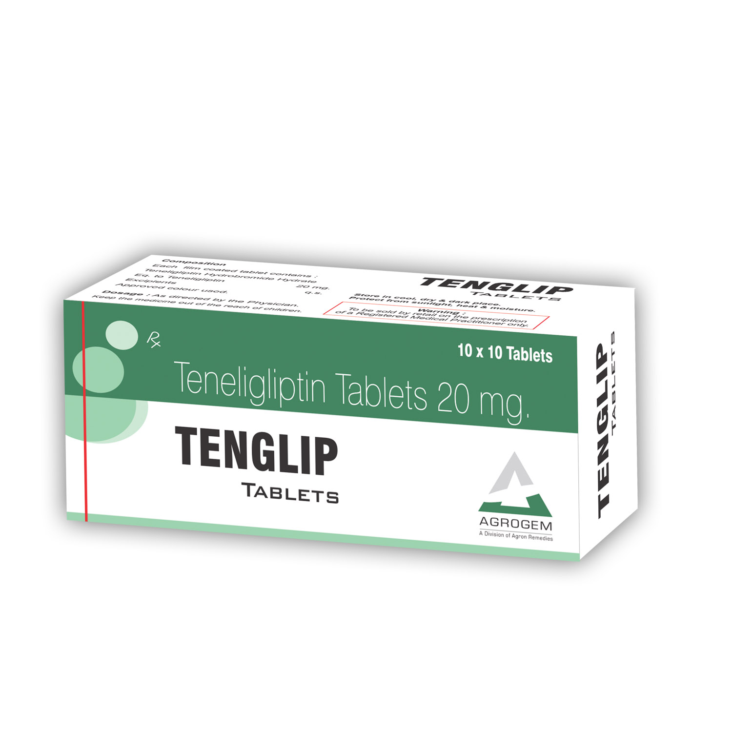 TENGLIP Tablets Product Name : TENGLIP Tablets Tablets Composition : Teneligliptin 20mg Tablets Packing : 10x10 Tablets Packing Type : ALU-ALU Tablets MRP : 1150 Per Box. Colour : N/A DOSAGE : As Directed by the Physician. STORAGE : Store in a cool, dark & dry place. Manufactured By : AGRON REMEDIES PVT. LTD. Certified Plant : WHO-GMP, ISO 9001-2015, TCL & JAS-ANZ Certified Company since 1986. Marketed By : AGRON REMEDIES PVT. LTD. Contact Number : +91 8859000627 Email Address : remedies.agron@gmail.com Official Websites : www.agronremedies.com www.agrogem.net Our Service : PCD Pharma Franchise, Third Party Manufacturing, Export & Govt. Tender Supply.